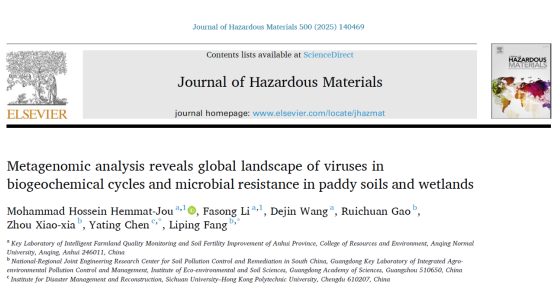 近日,公司太阳成tyc33455ccwww土壤污染修复与地力提升团队研究成果“Metagenomic analysis reveals global landscape of viruses in biogeochemical cycles and microbial resistance in paddy soils and wetlands”在中科院1区Top期刊Journal of Hazardous Materials(影响因子12.2)正式在线发表。太阳成tyc33455ccwww为论文第一完成单位,论文第一作者为Mohammad Hossein Hemmat-Jou博士和李法松教授,四川大学陈娅婷副教授与广东省科公司生态环境与土壤研究所方利平研究员为论文通讯作者。