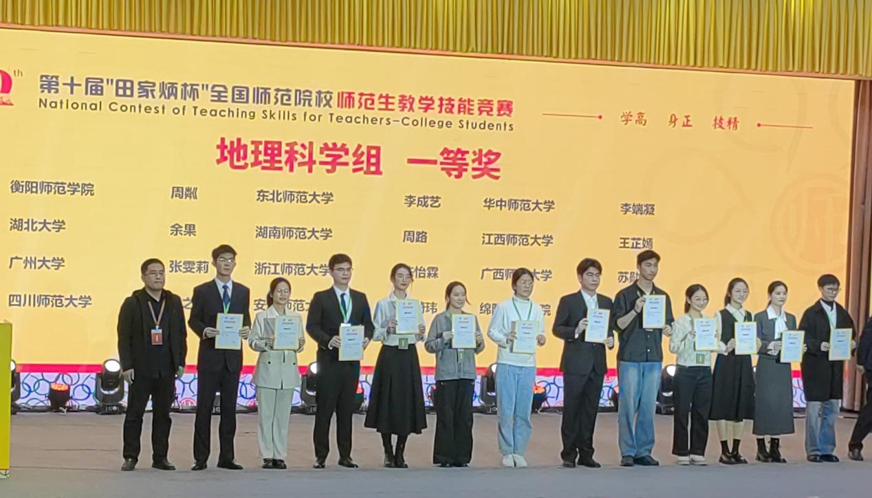 12月1日,第十届"田家炳杯"全国师范院校师范生教学技能竞赛决赛在浙江师范大学圆满落幕。本次大赛共吸引全国250多所师范院校1800余人参加,地理科学专业2022级(1)班王琦玮(指导教师:刘峰)凭借出色的表现荣获全国一等奖。