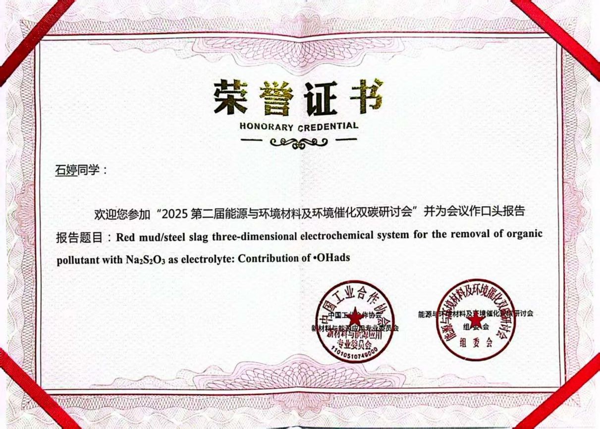 石婷介绍了以固废钢渣(SS)与赤泥(RM)为原料制备了颗粒电极RMSSx:y,在Na2S2O3为电解质的三维电化学系统中用于降解废水中的盐酸四环素(TCH)。使用Na2S2O3作为电解质来增强TCH降解的主要原因在于S2O32-离子的络合和还原作用。这些效应阻止了铁离子的浸出和沉淀,促进了Fe(III)的还原,从而使•OHads在降解过程中发挥主导作用。这些发现为利用SS和RM作为电Fenton过程中的功能材料提供了创新方法。