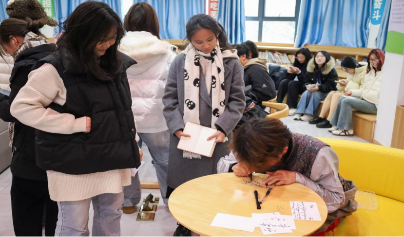 互动环节将现场气氛推向高潮。工作人员分发好书写纸片后,员工们纷纷围拢在藏族员工身边,请教藏文的写法。环境工程2024(2)班的吴攸拿着手里的纸牌翻看,纸牌一面是她的藏文名字,一面是藏文祝福,“这个写的是万事如意”她指着字样补充,“下次再见到这个藏文词语,我就能认出来了。”