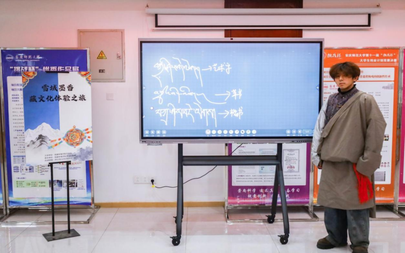 地理科学2024(2)班的格桑朗杰以“扎西德勒”为示例,向大家展示了藏文的艺术字、草书、楷书等多种字体,引得在场员工阵阵赞叹。