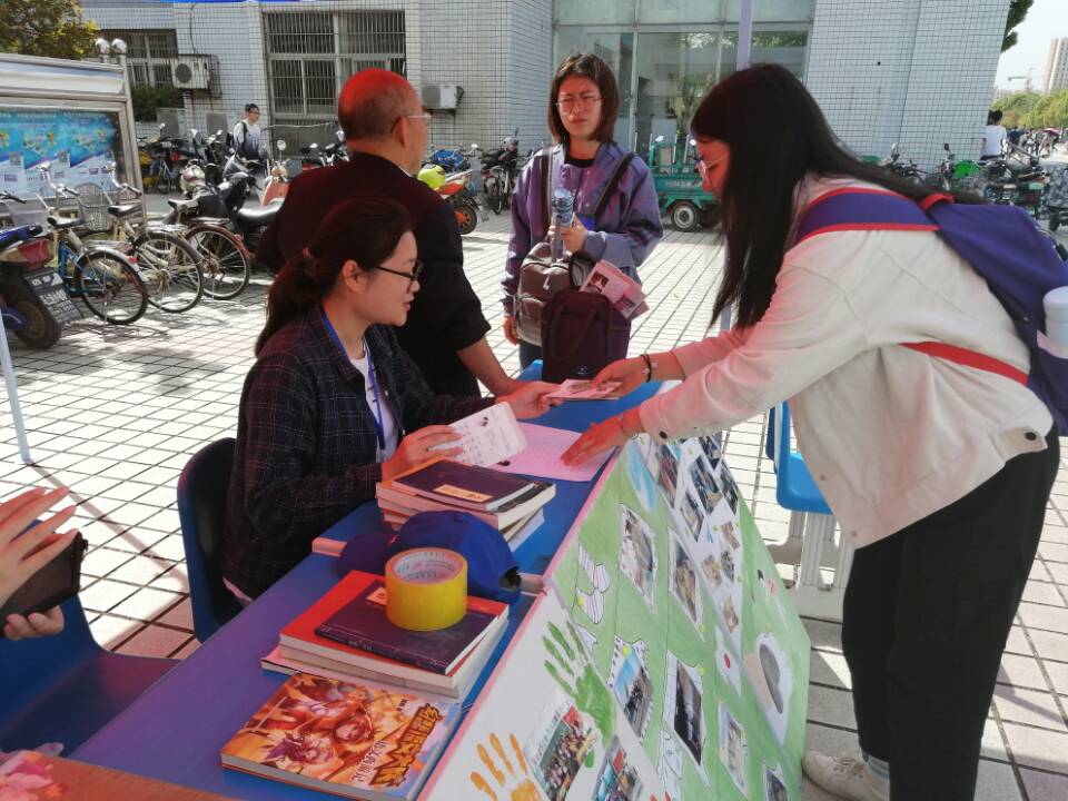 活动点有一位志愿者引人注意,她熟练地收书、发明信片、做介绍,动作迅速干练,她就是资源与环境公司环境工程专业2017(2)班的刘悦文。她已经是第二次参加捐书活动了。虽然已经不在志愿服务团工作,但是为了帮助更多孩子,也为了协助新成员办好此次活动,她在繁忙的学业中抽空来帮忙。