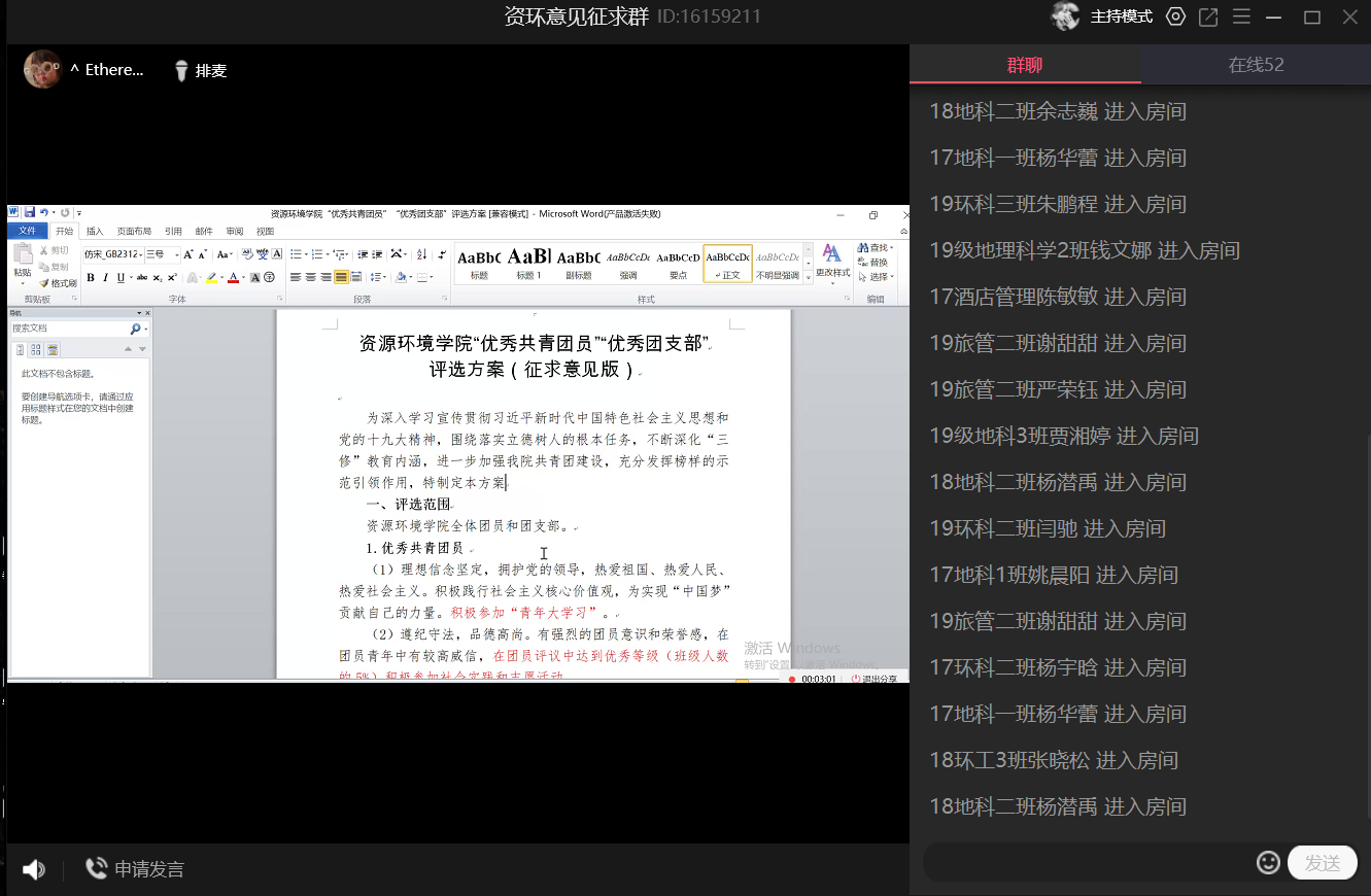 为了进一步规范团内评优工作,增强凝聚力,营造创优争先的良好学风,5月24日下午,公司团委组织召开了优秀共青团员、优秀团支部和先进班集体评选方案意见征求线上讨论会。2016—2019级各班员工代表等70余人参加。
