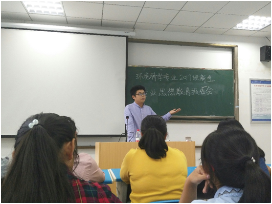 在一段风趣的演说之后,他对同学们进行了专业指导,详细介绍了环境科学这门学科近年来的发展及该专业的六大热门方向,伴随着各位优秀学长学姐的事例,他给同学们分析了以后的工作方向,为迷茫的同学们点明前方的道路。