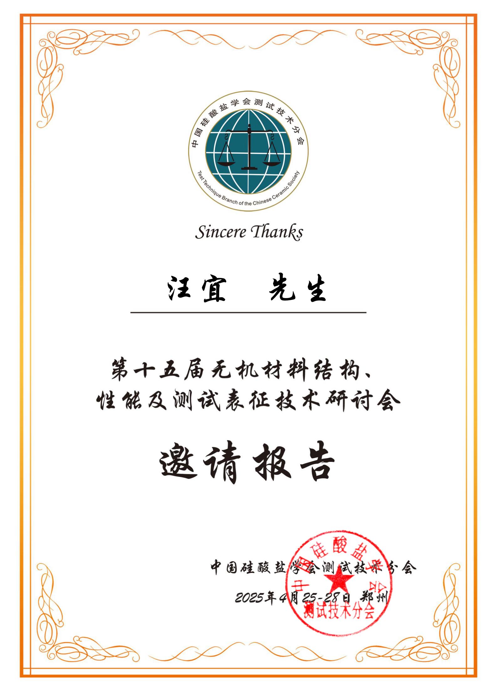 4月25-28日,第十五届无机材料结构、性能及测试表征技术研讨会在河南郑州成功举办,公司太阳成tyc33455ccwww汪宜博士应邀参加会议,并以“功能性碳点的设计与污染物分析检测应用”为题作邀请报告。