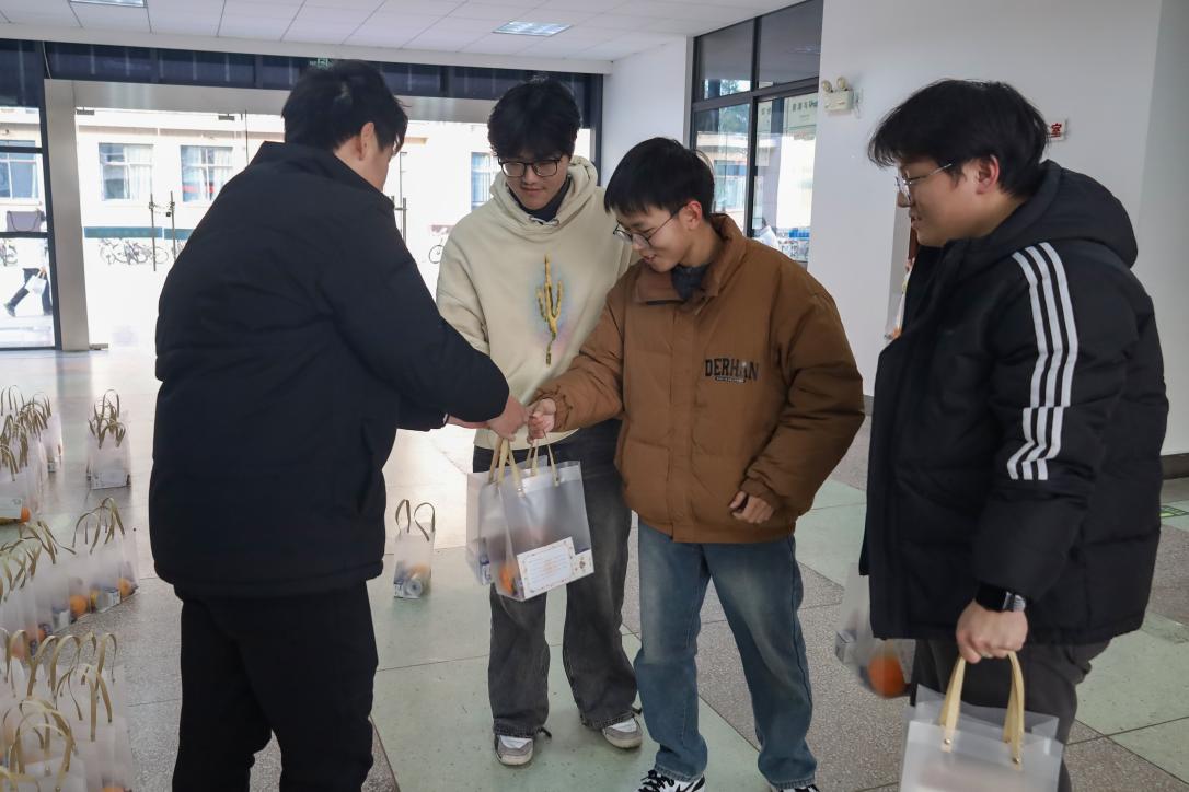 一张贺卡、一个橙子、一份心意……每一个分发给考研学子的礼包都被员工们塞的满满的。“每一个物品都是黄书记精心挑选的。”谈及礼包中不同物品的选择,地理科学专业2023(2)班的徐国瑞直言,每一项物品都有其特殊的含义,贺卡凝结着对考研学子的祝福;饮品“红牛”寓意鼓足干劲,迎接最后的冲刺;橙子则是运用谐音,希望员工们心想事“橙”,一战成硕。