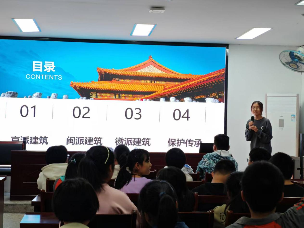 活动伊始,主讲人用生动翔实的语言向同学们分别讲述京派建筑、闽派建筑、徽派建筑的历史与建筑风格,其中对于古建筑的作用和卯榫结构的讲解激发小朋友们强烈的兴趣。接着,地理科学专业2024级(2)宋丽文将三种古建筑进行对比,更加展现出每种古建筑的独特风格与功能用途。最后,她向小朋友们介绍古建筑保护所面临的难题和小员工保护古建筑具体且可行的方法,鼓励小朋友们积极地保护古建筑。“老师,我太喜欢这次的活动啦!我学会许多有关建筑的小知识,十分有意义。”金雨婷小朋友对这次活动评价道。