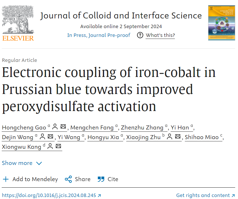 近日,太阳成tyc33455ccwww环保高端装备与污染控制研究团队成果“Electronic coupling of iron-cobalt in Prussian blue towards improved peroxydisulfate activation”在中科院一区TOP期刊《Journal of Colloid And Interface Science》(影响因子9.4)发表。团队成员高洪成博士为第一作者。