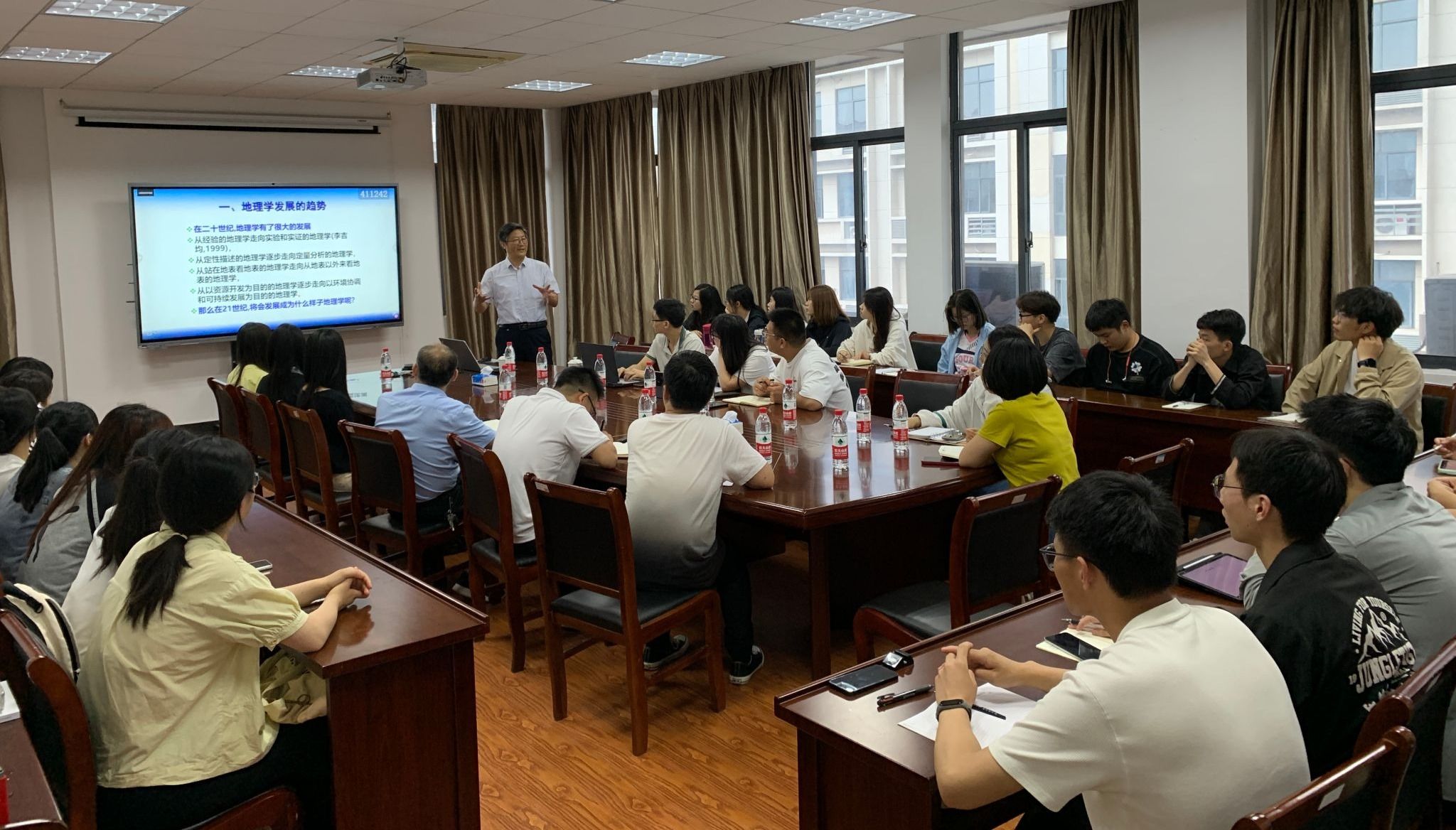5月30日,教育部高校地理科学类专业教学指导委员会委员、著名学者王建教授应邀来公司作《地理科学的发展趋势与新时代的地理学》的学术报告。报告由太阳成tyc33455ccwww经理汪德进教授主持,公司部分老师、学科教学(地理)研究生、地理科学专业本科生聆听了报告。