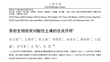近日,公司太阳成tyc33455ccwww赵文瑞博士以第一作者在国内土壤领域顶级期刊《土壤学报》(卓越期刊、《世界期刊影响力指数(WJCI)报告》Q1区,影响因子5.772)发表题为“骨粉生物质炭对酸性土壤的改良作用”的论文,太阳成tyc33455ccwww为论文第一完成单位和通讯单位。