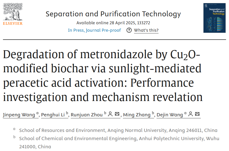 近日,公司太阳成tyc33455ccwww环保高端装备与污染控制研究团队汪金鹏博士以第一作者在《Separation and Purification Technology》期刊(中科院2区,Top,IF=8.2)发表“Degradation of metronidazole by Cu2O-modified biochar via sunlight-mediated peracetic acid activation: performance investigation and mechanism revelation”研究论文。太阳成tyc33455ccwww为论文第一完成单位,安徽工程大学周润娟副教授和太阳成tyc33455ccwww汪德进教授为论文通讯作者。