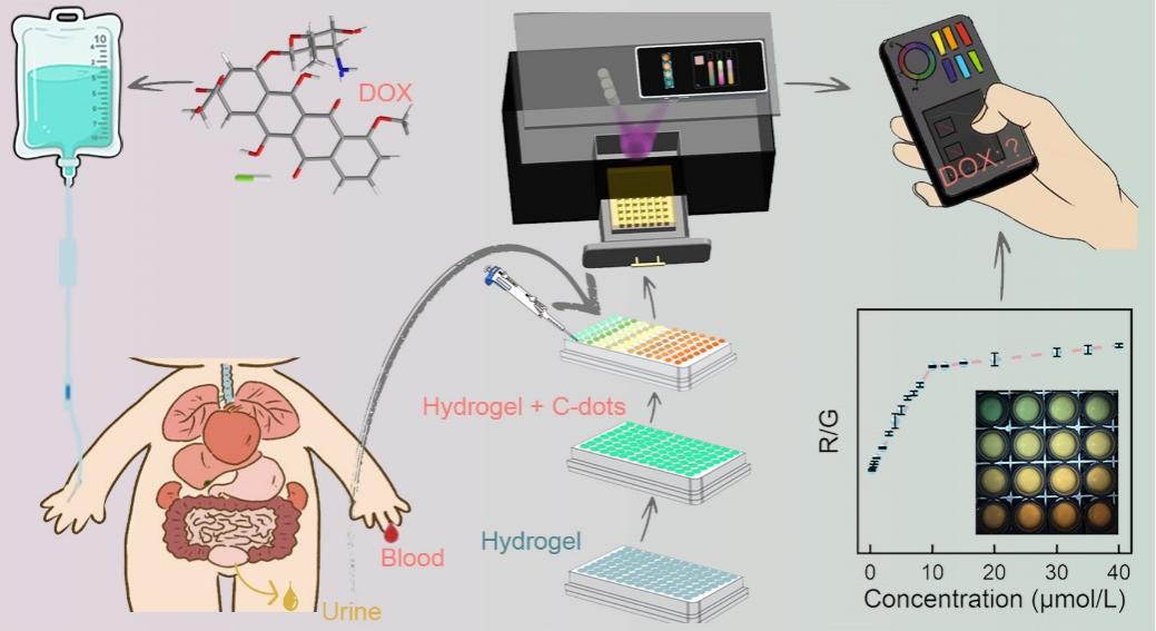 便携式现场检测平台是临床诊断、环境监测及食品分析领域的关键工具,其通过集成高灵敏传感器与小型信号读出装置,可实现分析物的实时、准确、快速检测。阿霉素(DOX)是临床常见的癌症治疗药物之一,但存在个体代谢差异大、全身毒性显著的特点,亟须通过临床即时检测实现用药监测与剂量调控。为此,团队开发了一种便携式自校准平台,结合碳点@水凝胶传感器和智能手机辅助的高通量成像设备,用于临床DOX传感。制备了带负电(−11.40±1.21 mV)的绿色荧光碳点(λem=508 nm),其发射光谱与DOX的特征吸收带(~500 nm)重叠,利用静电作用与带正电的DOX结合,借助Förster共振能量转移机制实现对DOX的高选择性、快速(20 s)、灵敏(检测限11.2 nmol/L)检测,且呈现出从绿色到红色的显著颜色变化;将该碳点与水凝胶结合构建荧光传感器,并集成3D打印的智能手机辅助装置,可实现高通量定量分析。在人尿液/血清样本中,DOX的加标回收率达96.4%~101.9%,相对标准偏差<2.9%(n=3)。该平台的双重线性检测范围与已报道的DOX在尿液和血液中的临床浓度范围(给药后0~4 h)相吻合,表明无需对实际样本进行特殊的预处理,即可利用该平台直接对临床样本中的DOX进行定量检测。凭借其优异的分析性能和可行性,为DOX临床用药监测提供了低成本、易推广的便携式技术方案。(撰稿:陶雷 供图:汪宜 审核:李法松)
