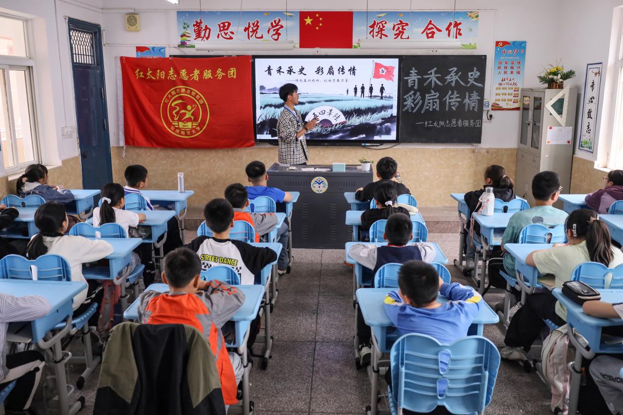 宣讲结束后,环境科学与工程类专业2024(2)班的胡恩泽拿出空白团扇,分发给围坐在一起的小朋友们。“大家可以把喜欢的历史人物形象或图案画在扇子上!”在胡恩泽的耐心引导下,Q版的鲁迅、李大钊、陈独秀以及不同的图案被员工们“复刻”在纸上。用笔尖先勾勒出图案的轮廓,再填充颜色、晕染色彩,五年级(2)班的韩雨茉不一会儿就完成了创作。“我画的是一颗五角星,是光明的象征。”韩雨茉举着扇子向朋友分享。