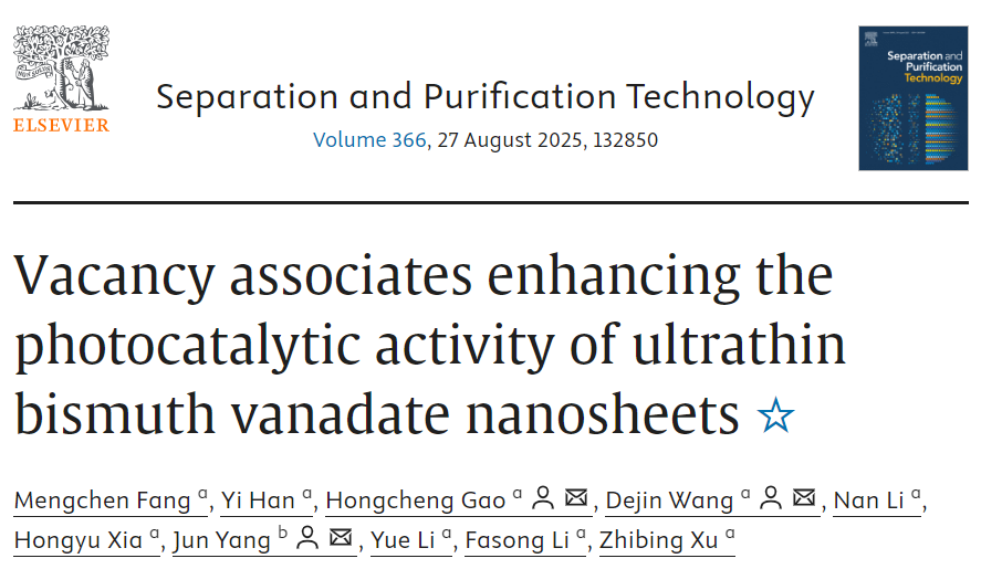 近日,太阳成tyc33455ccwww环保高端装备与污染控制研究团队2023级研究生方梦晨以第一作者在中科院二区TOP期刊《Separation and Purification Technology》发表 “Vacancy Associates Enhancing the Photocatalytic Activity of Ultrathin Bismuth Vanadate Nanosheets”研究论文,太阳成tyc33455ccwww为论文第一完成单位和通讯单位。论文指导老师和通讯作者为高洪成副教授和汪德进教授。